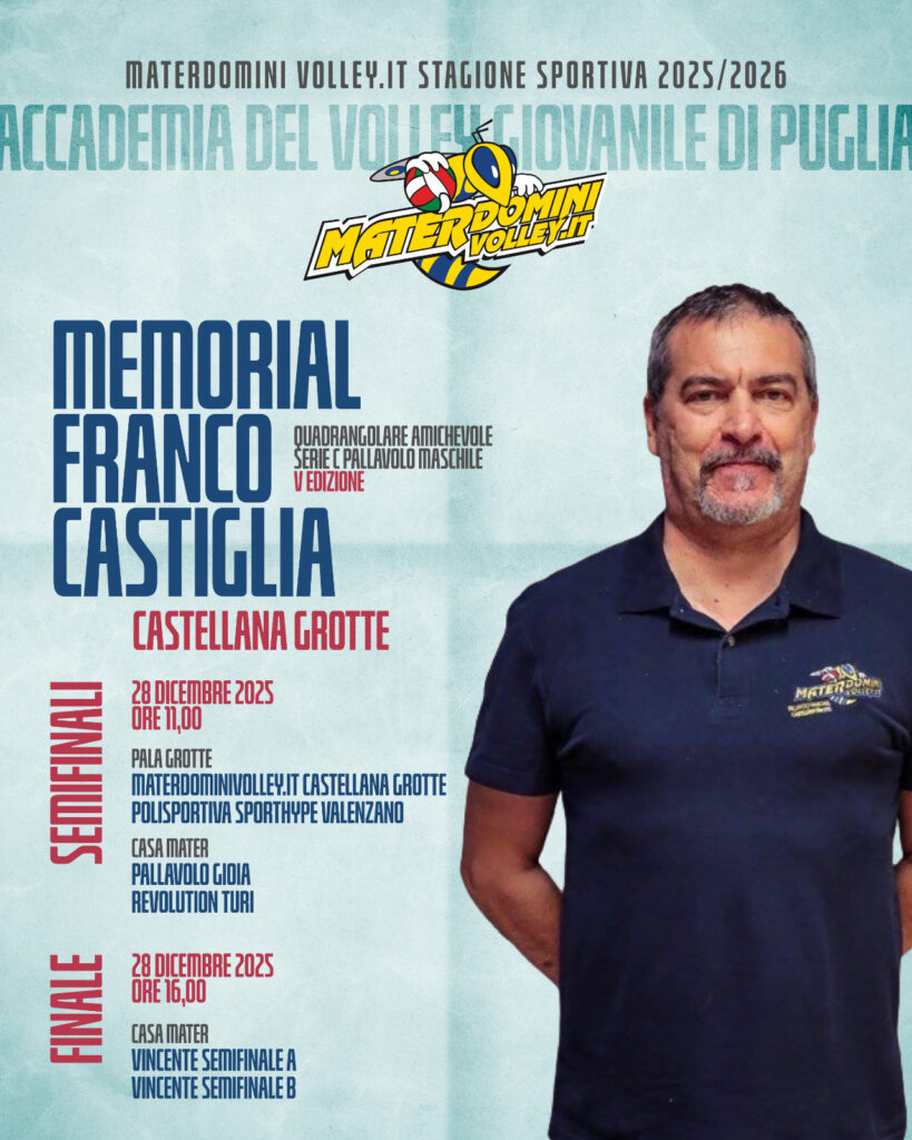 Materdominivolley.it Castellana Grotte, Turi, Gioia del Colle e Valenzano si sfideranno in memoria di mister Castiglia.Al via la quinta edizione del torneo “Memorial Franco Castiglia“, storico tecnico castellanese tragicamente scomparso all’età di 60 anni. L’academy del volley, club impegnato nel volley maschile giovanile, rinnova così l’appuntamento con il ricordo di un simbolo della pallavolo pugliese, […]